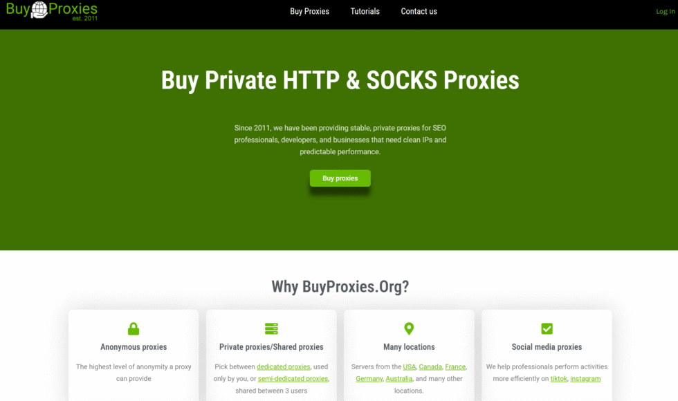 BuyProxies supplies stable private proxies since 2011, targeting SEO professionals, developers, and businesses requiring clean IPs for consistent performance. It offers dedicated and semi-dedicated options across multiple locations including the USA, Canada, France, Germany, and Australia. Strengths feature high anonymity, unlimited bandwidth, and 24/7 support from real personnel, even on holidays, with fast delivery in minutes. Proxies support social media on platforms like TikTok and Instagram, and the company provides custom browser addons for enhanced usability. Weaknesses could involve closed port 25, limiting SMTP email functions, and a reliance on proprietary servers that, while private, may require specific integration knowledge for advanced setups. The service’s clear terms and no hidden limits make it reliable for scraping sites like Amazon (semi-dedicated) or social tasks (dedicated), backed by a 24-hour refund policy.